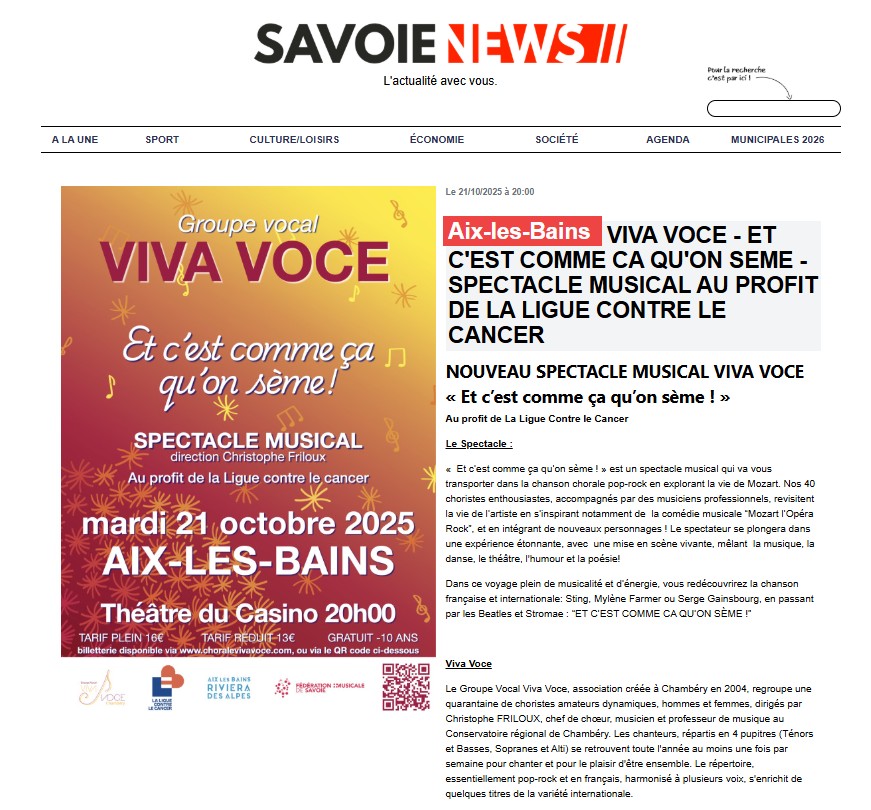 Article Savoie News : spectacle vocal Viva Voce Chambéry